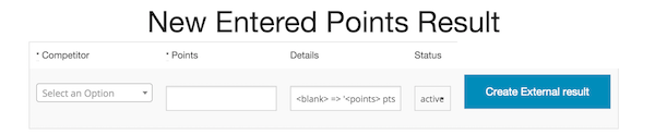 Externally scored competition results are entered, in which the points of competitors is entered, and a 'details' column, which is a description of the result (for use on the awards/results sheets). Whether (Higher or Lower) points are better can be chosen